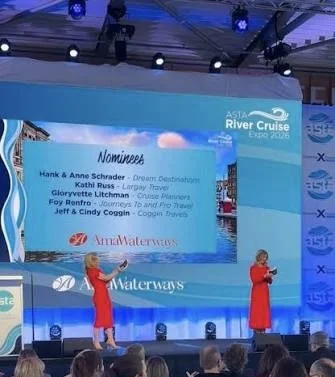 Kristin Karst & Alex Pinelo annoucing us as one of 5 Nominees for ASTA River Cruise Advisor of the Year for 2025 at the ASTA River Cruise Expo in Vienna
