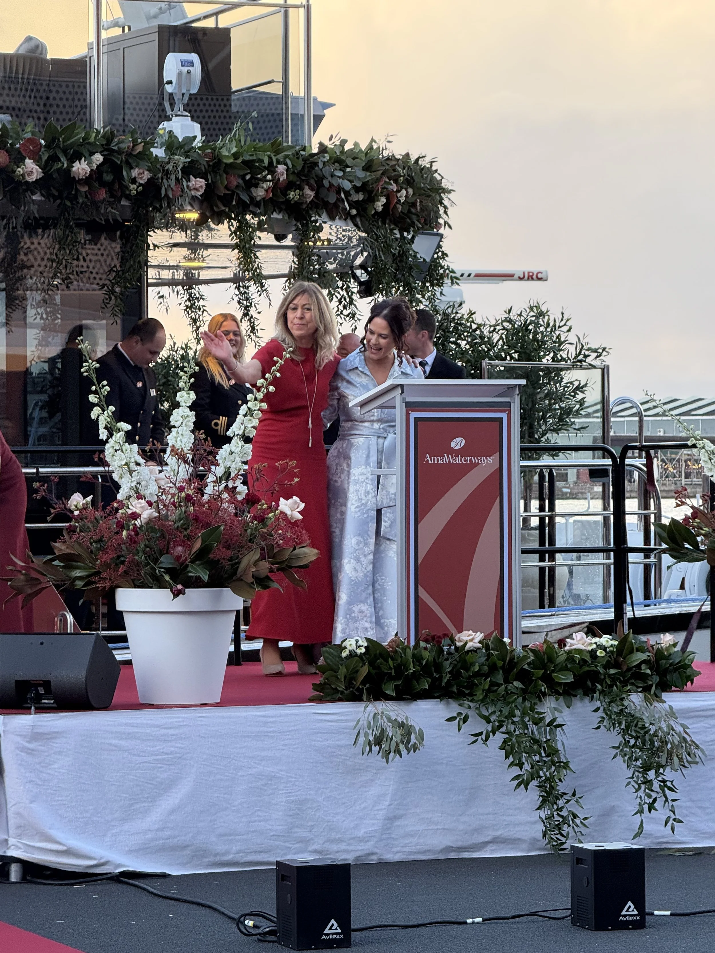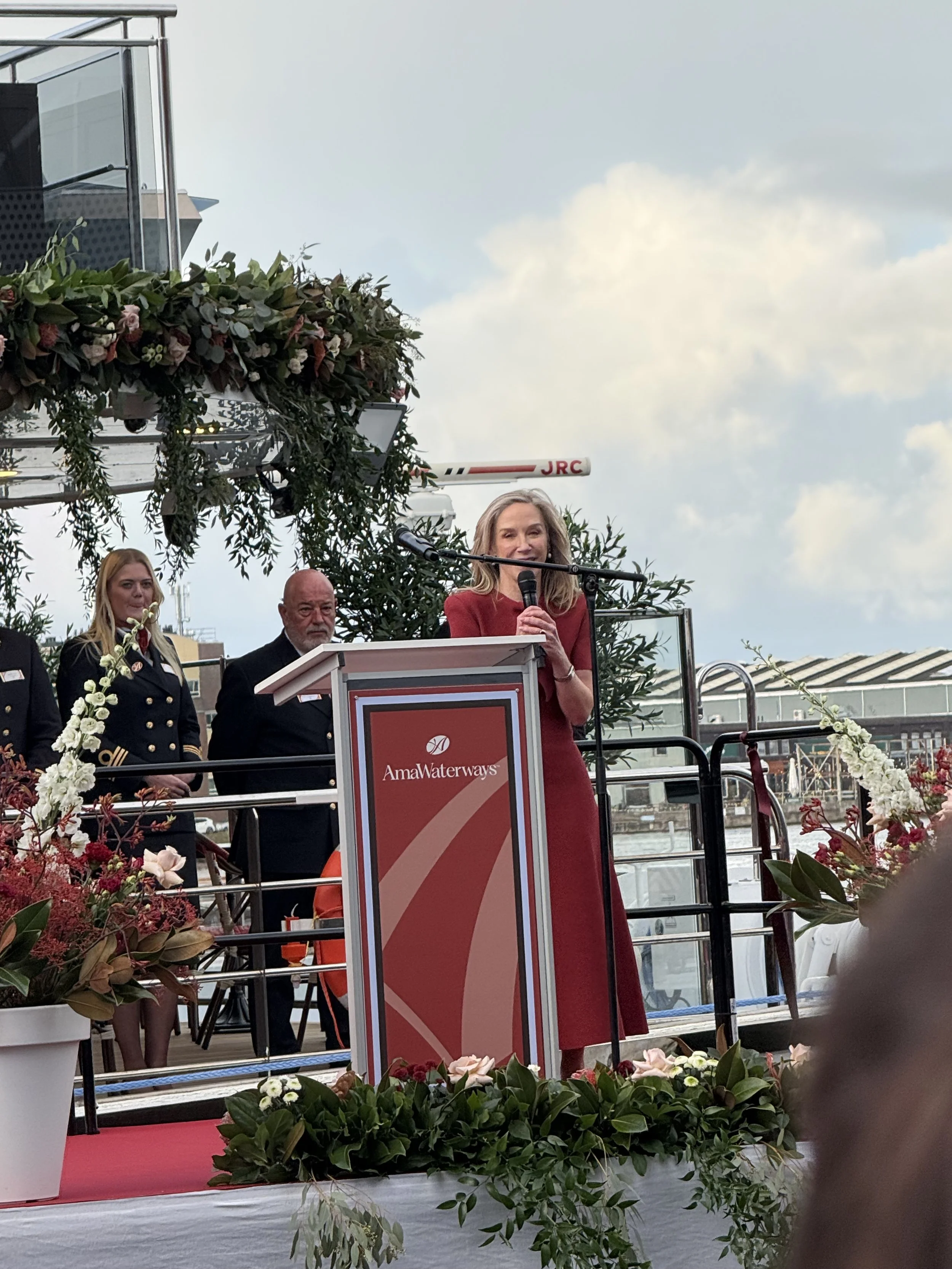 Kristin Karst, also an AmaWaterways Godmother, told the crowd “It is truley a very, very, moving moment. 20 years ago, we christened our first ship, the AmaDagio, here in Amsterdam. And today it is my pleasure to have Sarah Little—she is your travel advisor representative. name the AmaSofia.”