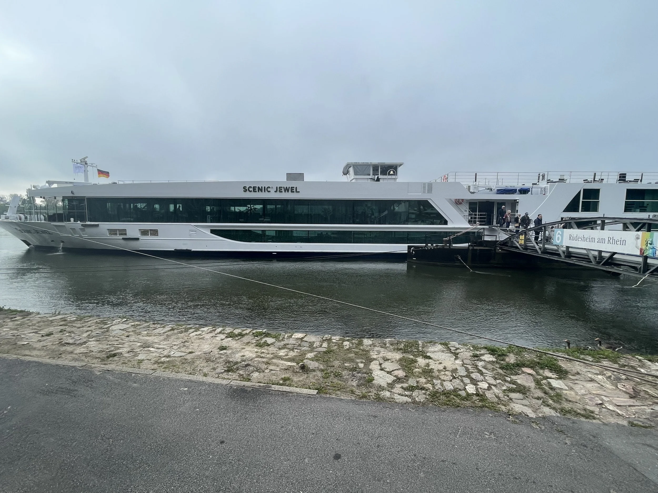 The Scenic Jewel ported in Koblenz, showing the gangeway to get on and off the ship. In the background is Ehrenbreitstein Fortress.