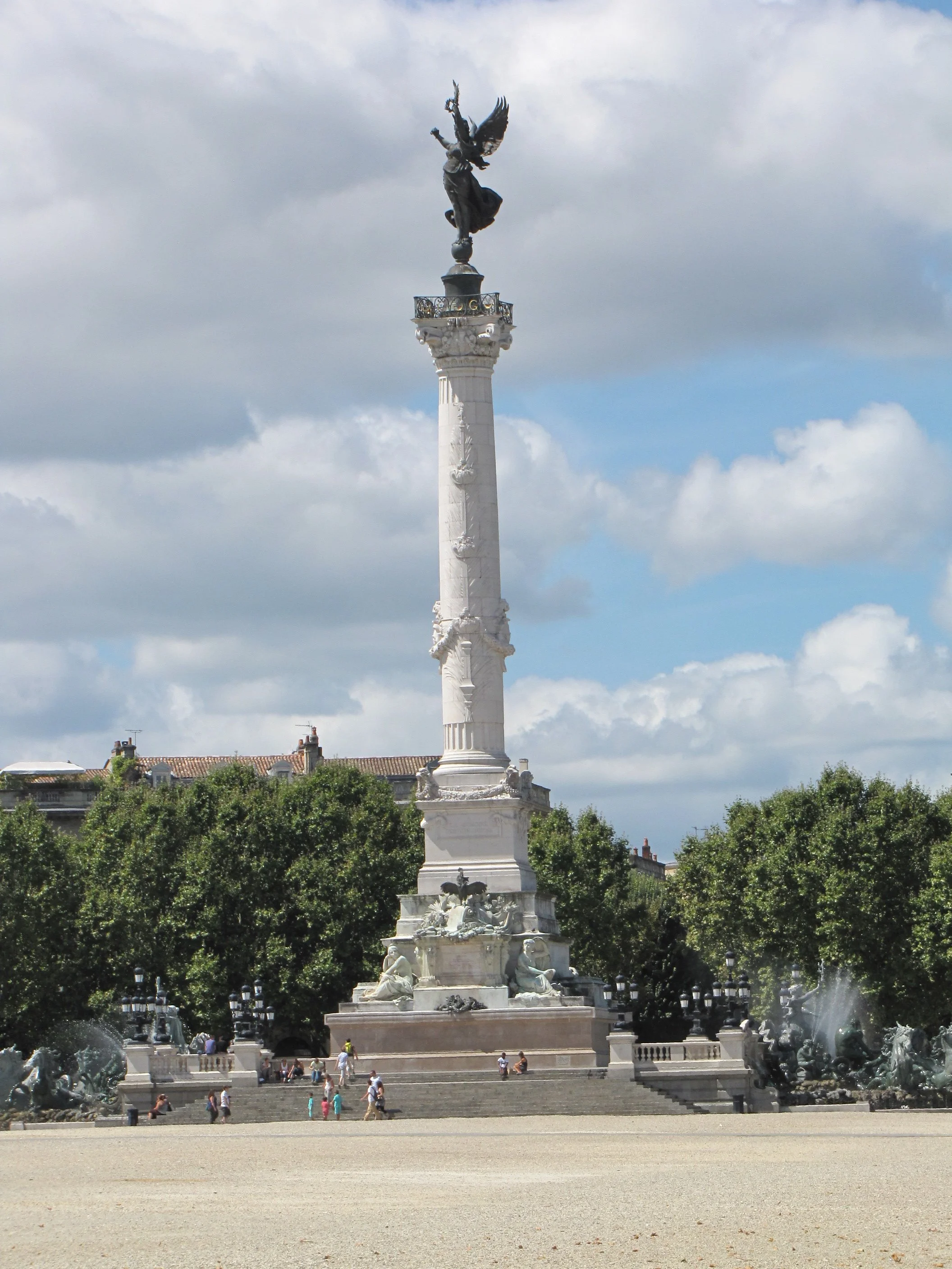 Bordeaux has a large square with a very large fountain. The name of the square is Place des Quincoces. It has two 21-meter rostral columns which symbolize commerce and navigation.
