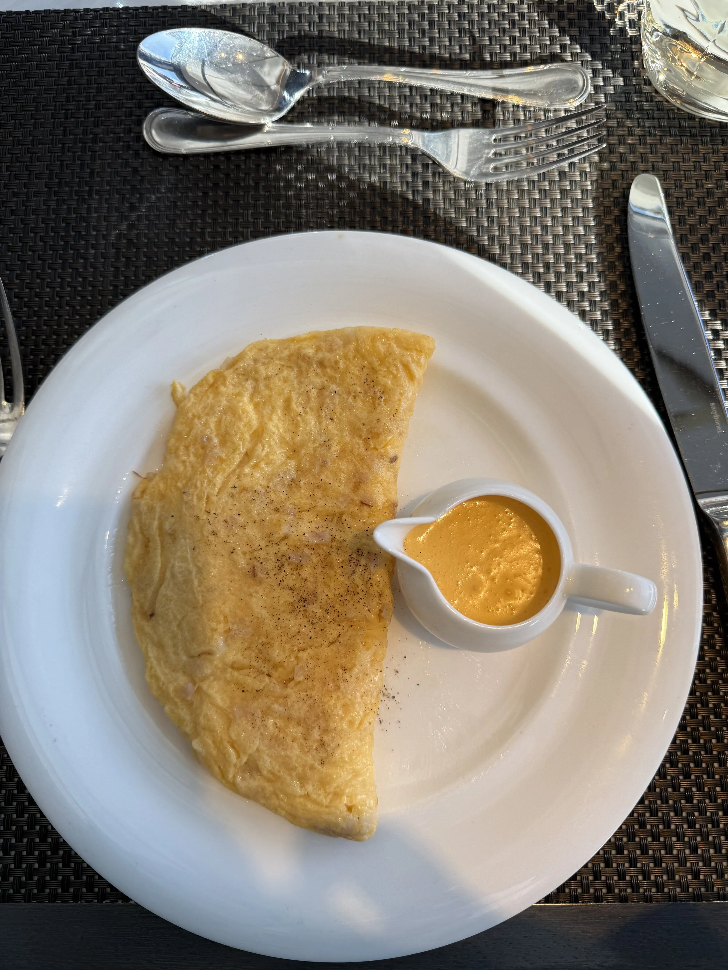 Anothe good choice would be a ham and cheese omelet with holandaise sauce—my go to at the main dining room